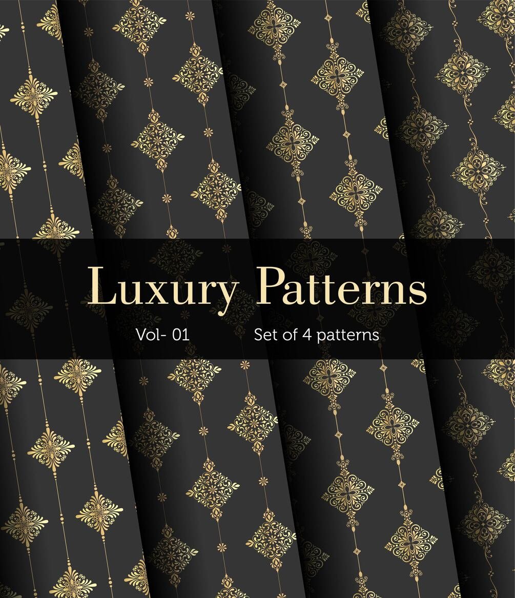 Luxury Pattern Designs. These luxurious patterns are created in vector format with metallic colors. it can be used on wallpaper, background, packaging, or any decorative designs.